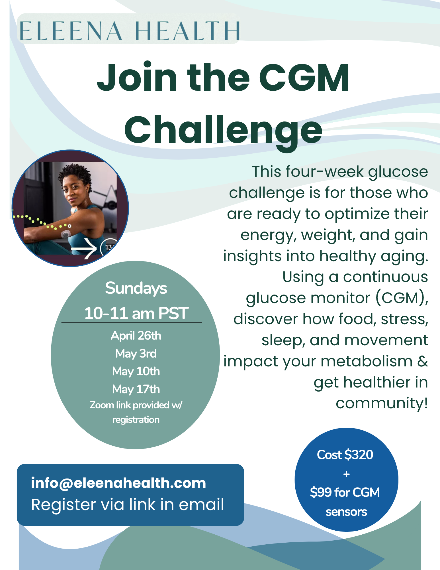 Join the spring edition of our 4-week virtual Continuous Glucose Monitor Challenge! This program is designed to help you understand your blood sugar and how it impacts your energy, weight, and long-term health. Using a continuous glucose monitor, participants will learn how food, stress, sleep, and movement influence blood sugar and metabolism, while building healthier habits in a supportive group setting.